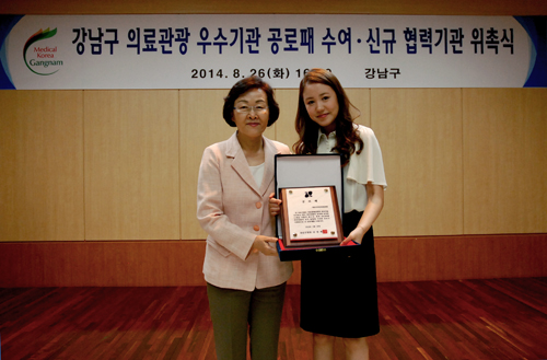 예송이비인후과 음성센터(이하, 예송음성센터)는 지난 26일 강남구청에서 ‘강남구 의료관광 외국인 환자 유치 우수기관’으로 선정되어 공로패를 수여했습니다. 이번 수여식에는 신규 협력기관 위촉식과 함께 진행되었으며, 강남구청에서 2013년도 외국인환자 유치활동에 남다른 노력으로 지역경제 활성화에 기여한 의료기관을 선정하였습니다. 예송음성센터를 포함, 총 병·의원급 21개의 강남구 의료기관(삼성서울병원, 강남차병원, 미즈메디병원, CDC어린이치과병원, 자생한방병원, 차움의원, 서울대학교병원 강남의원 등)이 참석해 공로패를 수여하였으며, 이비인후과로는 예송음성센터가 유일하게 이름을 올렸습니다. 예송음성센터는 2007년부터 1:1 해외환자 맞춤 진료 시스템으로 전문적인 해외환자 유치와 더불어 외국인의사 국내연수사업, 동북아시아지역 나눔의료사업, 카자흐스탄 국립병원 마스터클래스 등의 국제 의료 사회 공헌 활동 그리고 국제이비인후과연맹 세계학술대회(IFOS), 모스크바 국제 의료관광 협의회(MHTC), 유럽의학센터(EMC) 의료협력 및 의료진 교육연수 MOU 등 다양한 국제행사 참가·추진하여 한국의 선진 의료 기술을 널리 알린 공을 인정 받아 외국인환자 유치우수기관으로 공로패를 수여 받았습니다. 예송음성센터 김형태 원장은 “이번 공로패 수상으로 세계화(globalization)에 맞는 의료 기술과 서비스를 제공하는 음성센터로 인정 받게 되어 기쁘다”며 ”미국, 스페인, 브라질, 프랑스, 영국, 이탈리아, 러시아, 중국 등에서 오는 해외 환자들이 먼저 알아보는 한국 예송만의 의료 기술 우수성과 서비스에 만족하는 모습을 볼 때 더욱 더 자부심이 생긴다”고 전했습니다.