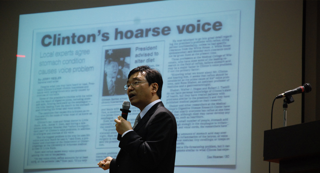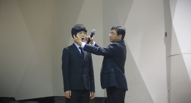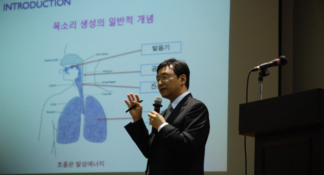 서울예고 음악부 대상, ‘발성의 이해와 올바론 목소리 관리법’ 특강 예송이비인후과 음성센터 김형태 원장은 지난4월19일 서울예술고등학교 대강당에서 음악부 학생들을 대상으로 ‘성악도들을 위한 발성의 이해와 올바른 목소리 관리방법’을 주제로 특강을 실시했습니다. 서울예고 음악부 학생120여명을 대상으로 진행된 이번 특강에서 김형태 원장은 발성의 원리와 성악가들일 흔히 겪을 수 있는 음성 질환, 그리고 예방법 등을 고등학생 눈높이에 맞춰 다양한 그림과 동영상들을 활용해 알기 쉽도록 설명해 좋은 반응을 얻었습니다. 약1시간 동안 진행된 강의 시간 동안 학생들은 흥미로운 장면이 나올 때마다 탄성을 금치 못했으며 강의가 끝난 후에는 성악부 학생을 대상으로 한 원포인트 레슨도 진행했습니다. 이날 강의를 들은 한 학생은 “성악가들에게 최상의 목소리 상태를 유지하는 것이 얼마나 중요한지 알게 된 귀중한 시간이었다”고 전하고 “실제로 잠깐의 지도를 통해 발성이 달라지는 것을 보고 많이 놀랐다”고 소감을 밝혔습니다.