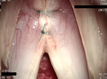 양쪽 성대 근육의 앞쪽 부분을 꿰맨 후 매듭을 집니다.